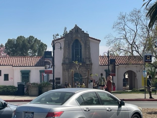Peut-être que vous pensez qu’il n’y a que des autoroutes ici, et pas de trains. Ce n’est pas vrai. Voici la gare, un bâtiment de 1927 classé monument historique, d’où on peut aller à Los Angeles :