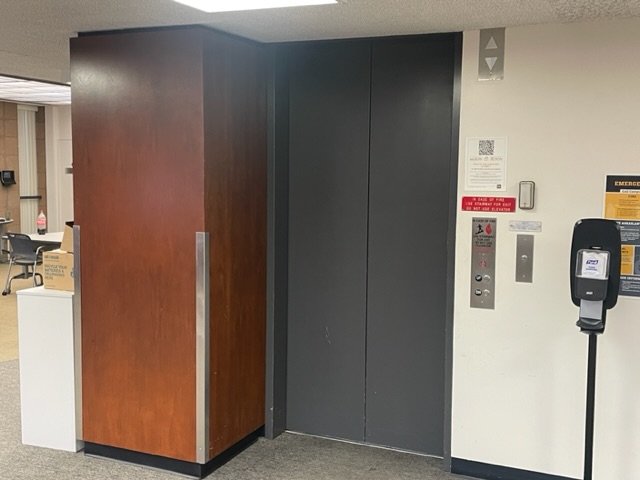 Aussi, pendant ma troisième année — n’oubliez pas qu’aux États-Unis, on pass 4 ans à la fac, pas 3 — un ami m’a persuadé de demander rendez-vous à une fille en l’appelant du téléphone au-dedans de l’ascenseur à l’intérieur de la bibliothèque. Voici l’ascenseur :