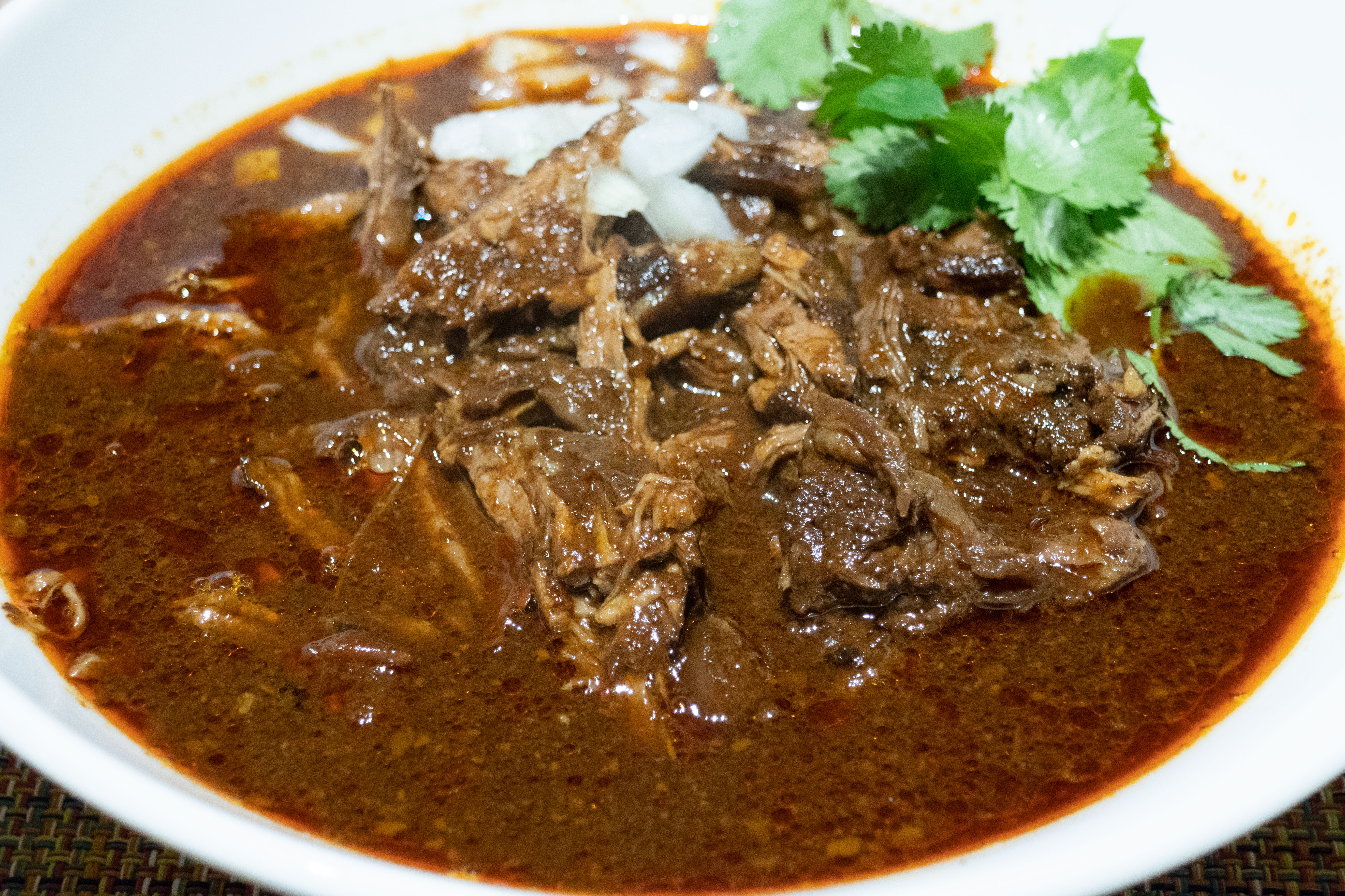 - Mettre de la viande dans des bols pour servir. Verser de la soupe au-dessus de chacun. Garnir avec des dès d’oignon et des feuilles de coriandre. Si vous avez besoin de plus de liquide, ajouter du bouillon de bœuf, mais ce ne sera pas la même chose que le liquide qui a passé des heures avec toutes ces épices et de la viande. Servez avec des tranches de citron vert et des tortillas.