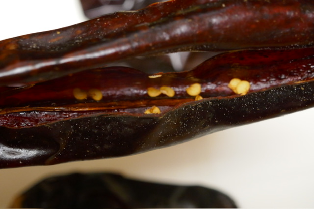 - Couper les piments en deux, jusqu’aux tiges, et retirer les graines. Puis retirer les tiges.