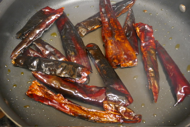 - Faire frire les piments dans une poêle avec un peu d’huile pendant 2-3 minutes. Remuer sans cesse pour qu’ils ne brûlent pas. Ne nettoyez pas la poêle.