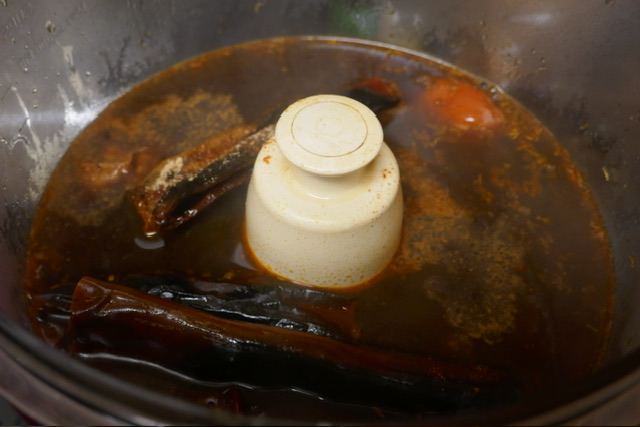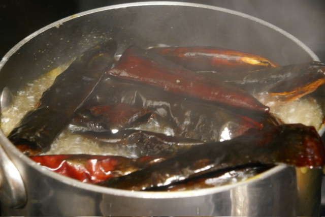 - Mettre les piments frits dans l’eau bouillante et laisser devenir mous pendant 10 minutes.
