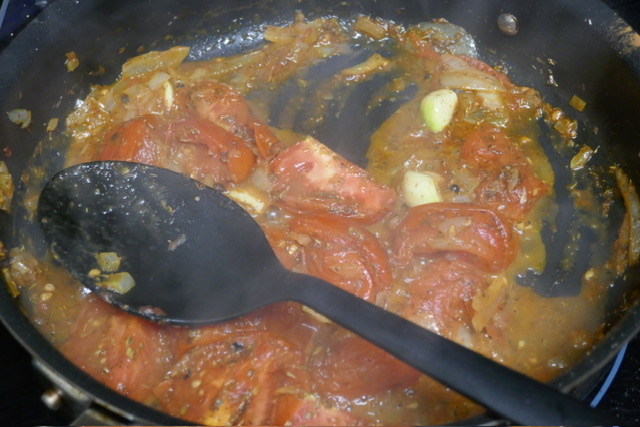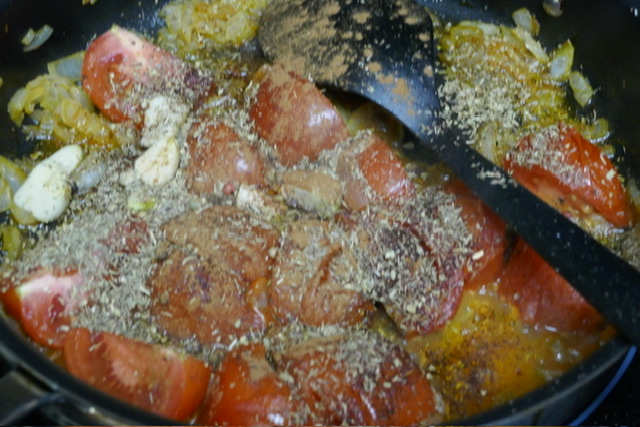 - Dans la poêle de la 4e étape, ajouter plus d’huile puis faire revenir les tomates et les oignons. Puis ajouter l’ail, la cannelle, les grains de poivre, les feuilles de laurier, le thym, la marjolaine, l’origan, et les clous de girofle. Continuer à faire cuire pendant 5 minutes de plus, en remuant souvent.