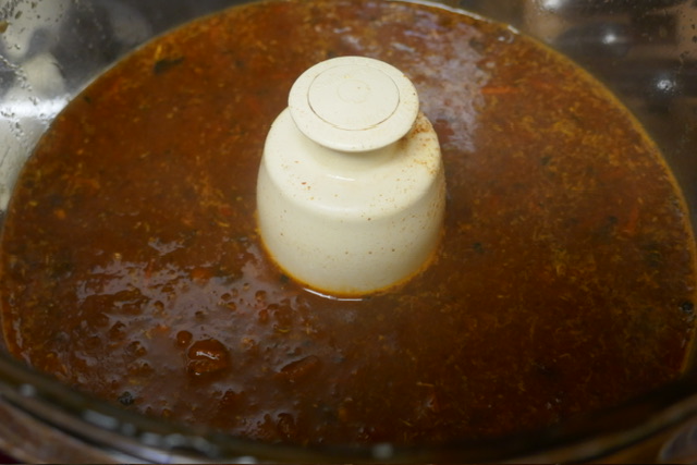 - Dans le bol d’un mixeur ou robot ménager, mettre le mélange de l’étape précédente, les piments — dont l’eau, la poudre de cumin, le gingembre, et le vinaigre de cidre. Mélanger jusqu’à ce que le tout devienne liquide. Il sera épais.