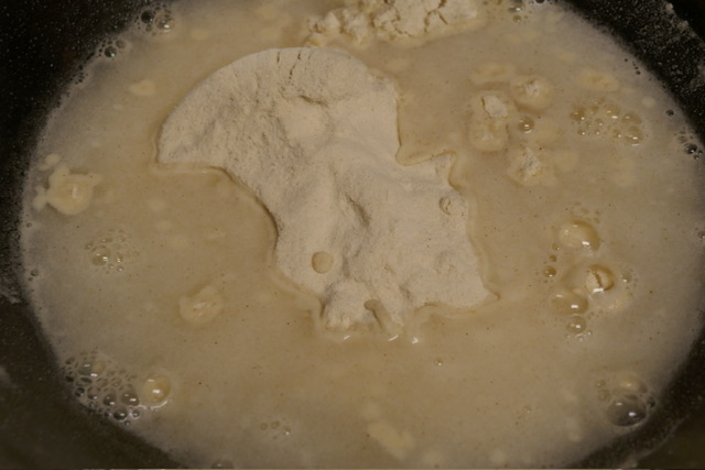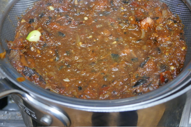 - Sur une grande casserole, tamiser le liquide. J’ai retenu une cuillère à soupe des solides et les ai rajoutés au liquide, mais ce n’est pas strictement la recette