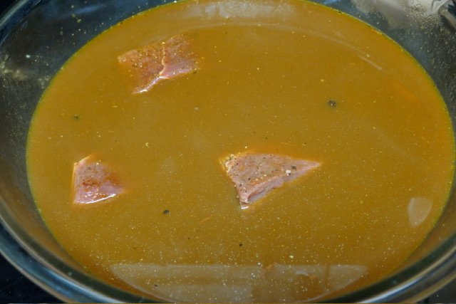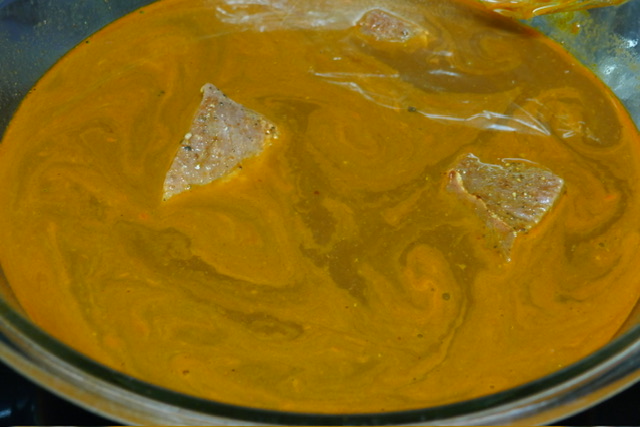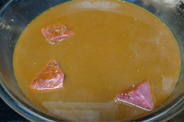 - Mettre la viande dans un grand saladier. Verser le liquide au-dessus. Couvrir avec du film à contact. Laisser reposer au frigo 1-2 heures.