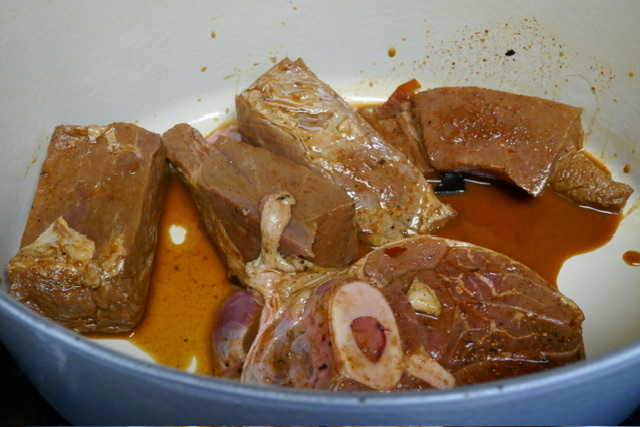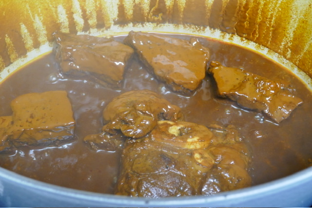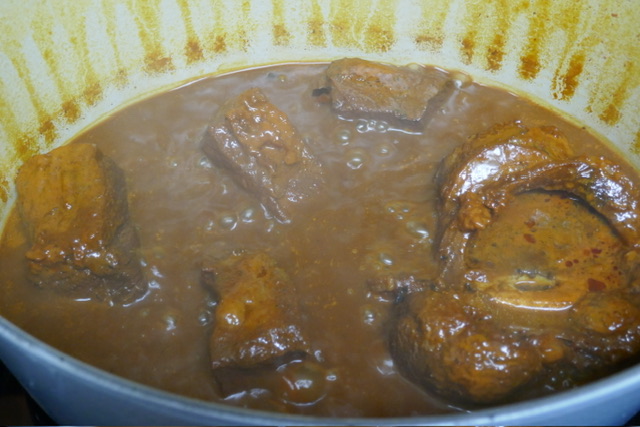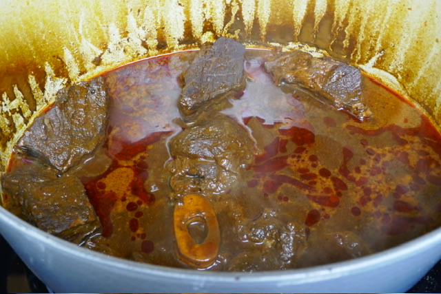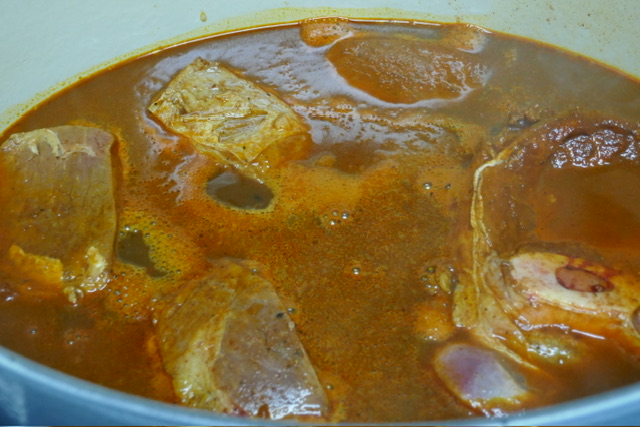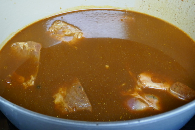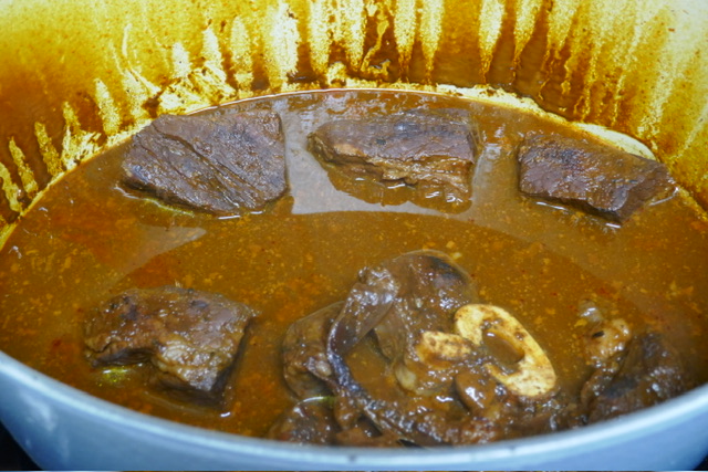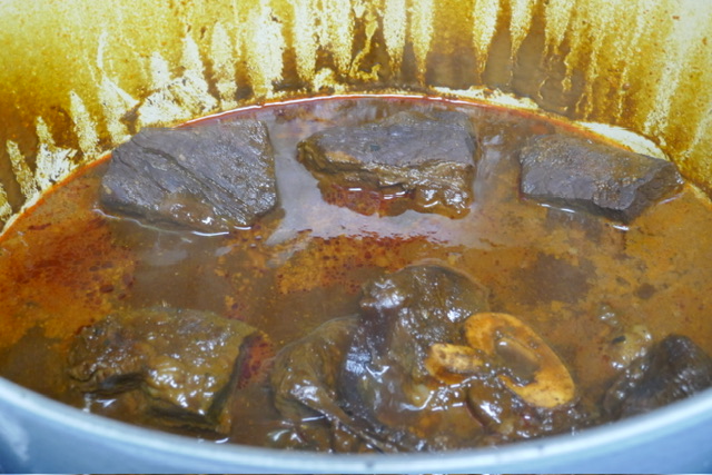 - Laissez mijoter pendant 3 heures. Chaque 45 minutes, retirer le couvercle, retourner la viande et remuer. Apres les premières 45 minutes, retirer la graisse de la surface. Après 90 minutes, j’ai ajouté 250 ml d’eau. J’aurais dû ajouter 500 pour avoir plus de soupe à la fin.