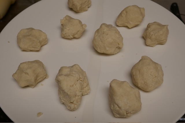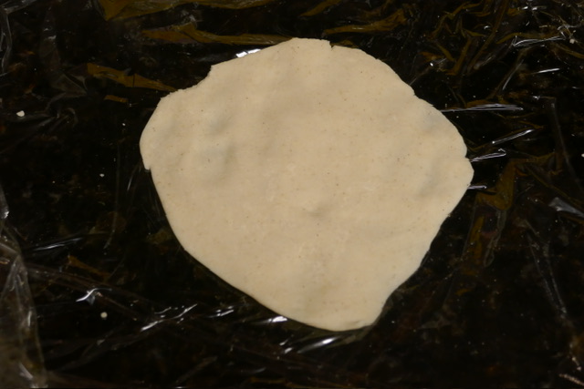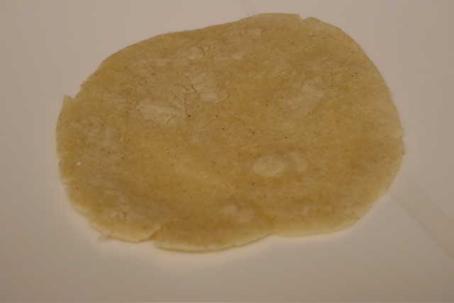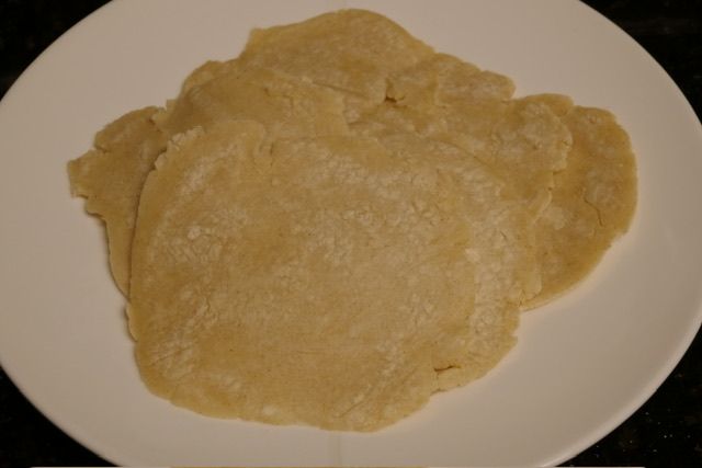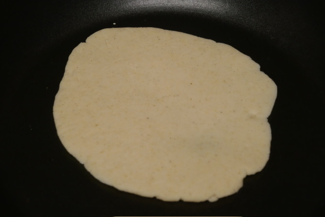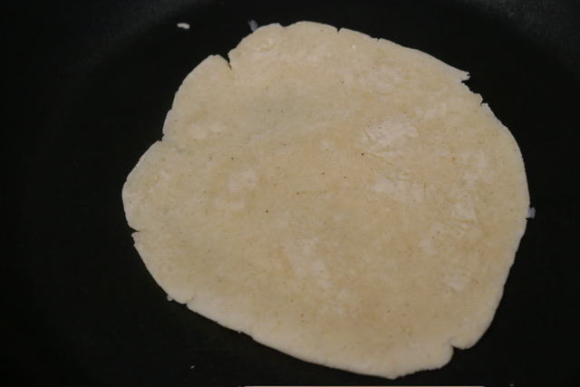 - Suivez les instructions sur votre sac de farine, selon la quantité de tortillas voulue. Je n’ai pas de presse de tortillas, alors j’ai fait des balles, et les ai aplaties à la main entre deux feuilles de film à contact. Puis, je les ai cuites sur un feu moyen-vif avec