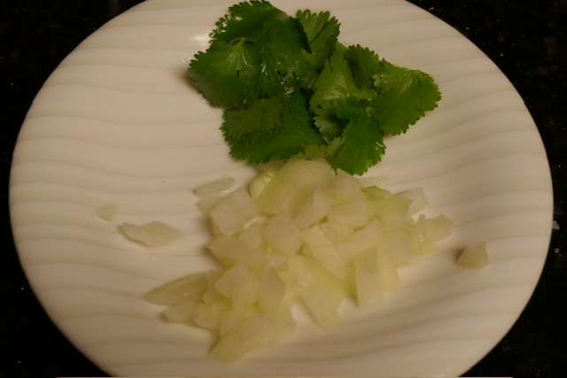 - Pendant les dernières 45 minutes, préparer les tortillas si besoin. (Lisez en bas.) Couper le reste de l’oignon en dès, et laver des feuilles de coriandre.