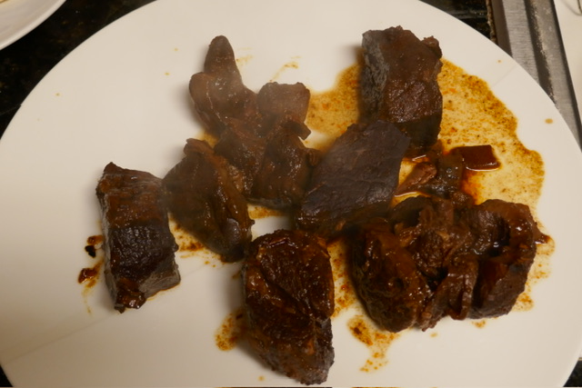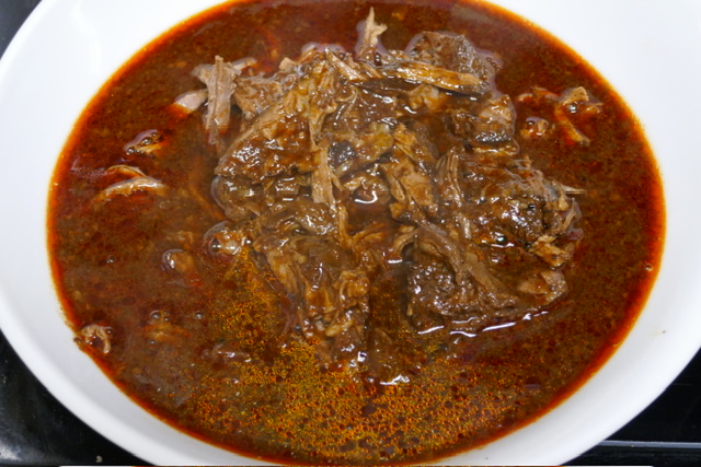 La birria peut être servie de plusieurs manières, dont une soupe ou des tacos, dits « quesabirria ». Puisque la vidéo de mon amie passe aux tacos, alors que je voulais préparer la soupe, j’ai aussi consulté My Latina Table et House of Yumm. Ce dernier a de bonnes instructions pour la soupe, mais leurs ingrédients sont trop différents. La vidéo et le premier blog sont d’accord. Avec cette quantité de liquide, 3 livres (1,4 kg) de viande est plus habituel — j’ai utilisé 0,7 kg, et j’aurai 3 repas pour moi-même en résultat (le temps que ce soit publié, j’en aurai déjà mangé 2). Aussi, j’ai utilisé des piments guajillos, avec une peu de poudre de piment ancho — voici deux sources en France. Finalement, j’ai oublié d’acheter un citron vert, qu’il fait servir en accompagnement.