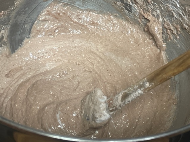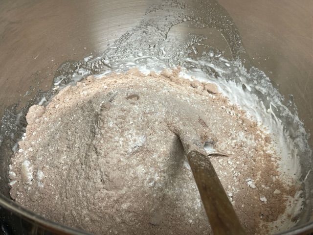 1. Verser les ingrédients secs dans le bol du robot pâtissier. Avec une maryse, mélanger le tout, jusqu’à ce que vous obteniez un ruban lisse qui tombe lentement de la maryse.