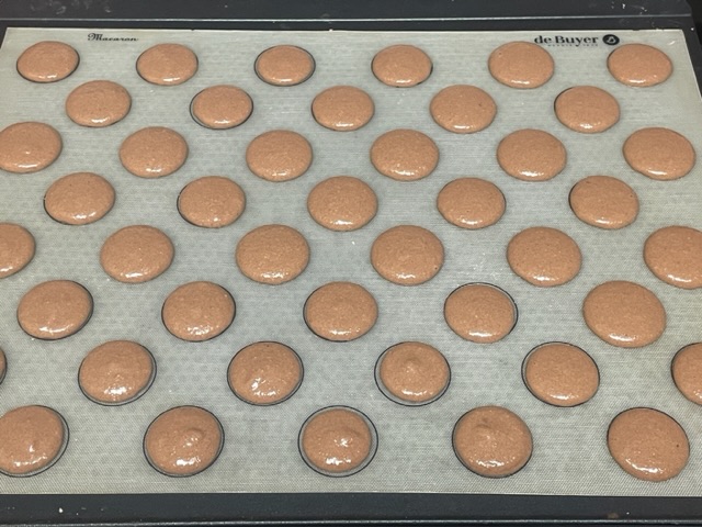 2. Mettre la pâte dans une poche à douille, avec une douille plate de même taille que les cibles sur un tapis de macarons, de son tour en haut d’une plaque de cuisson. Vous allez pocher presque assez de pâte pour remplir les cercles. La pâte va gonfler pendant la prochaine étape.