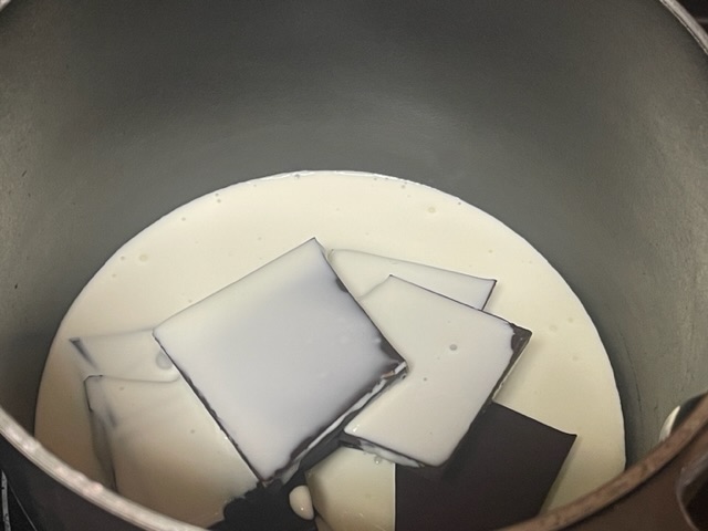 1. Mettre le chocolat dans une casserole et y verser la crème. Il n’y a pas besoin de bain-marie — mais le feu doit être très doux. Ma ganache est toujours parfaite, et ne se sépare pas, mais elle prend du temps.