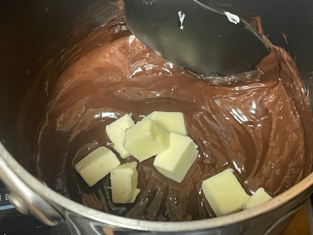 1. Si vous avez une cuisinière à induction comme moi, retirer la casserole complètement. On ne veut aucun chaleur pour cette étape. Ajouter le beurre et remuer jusqu’à ce que tout soit incorporé.