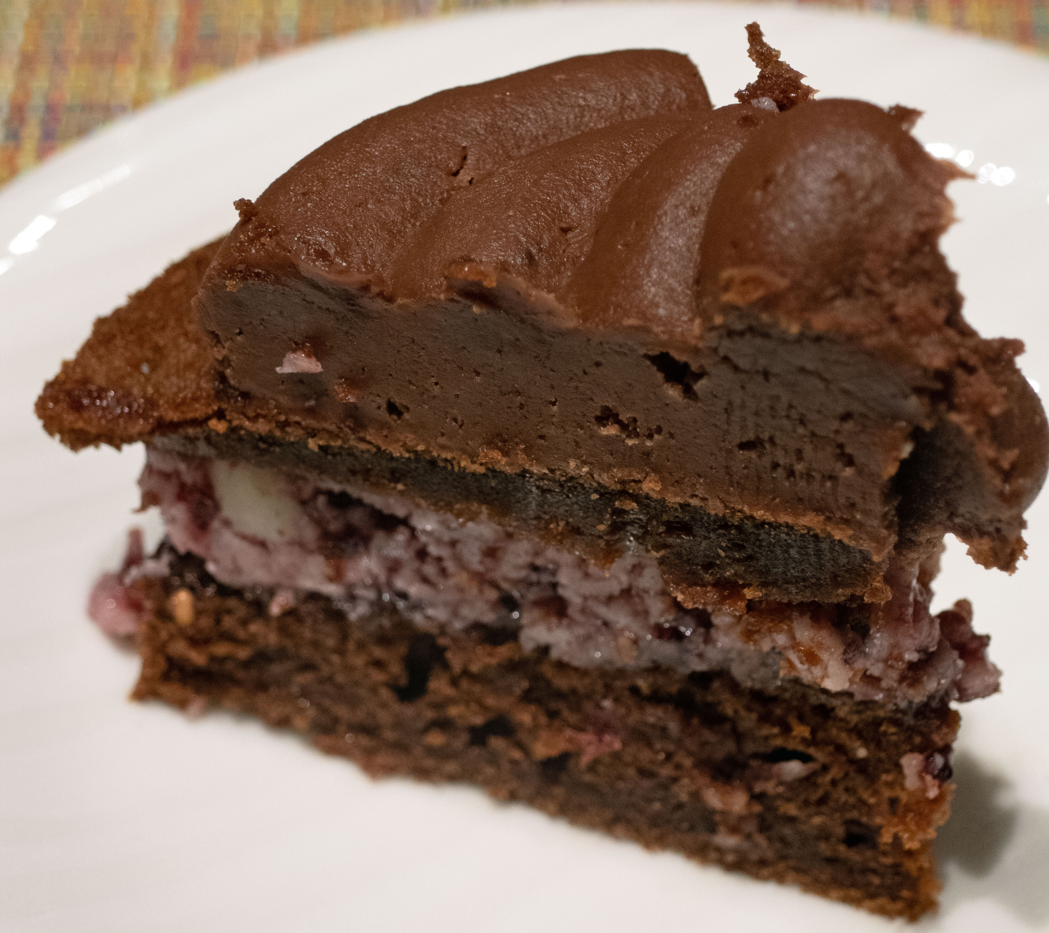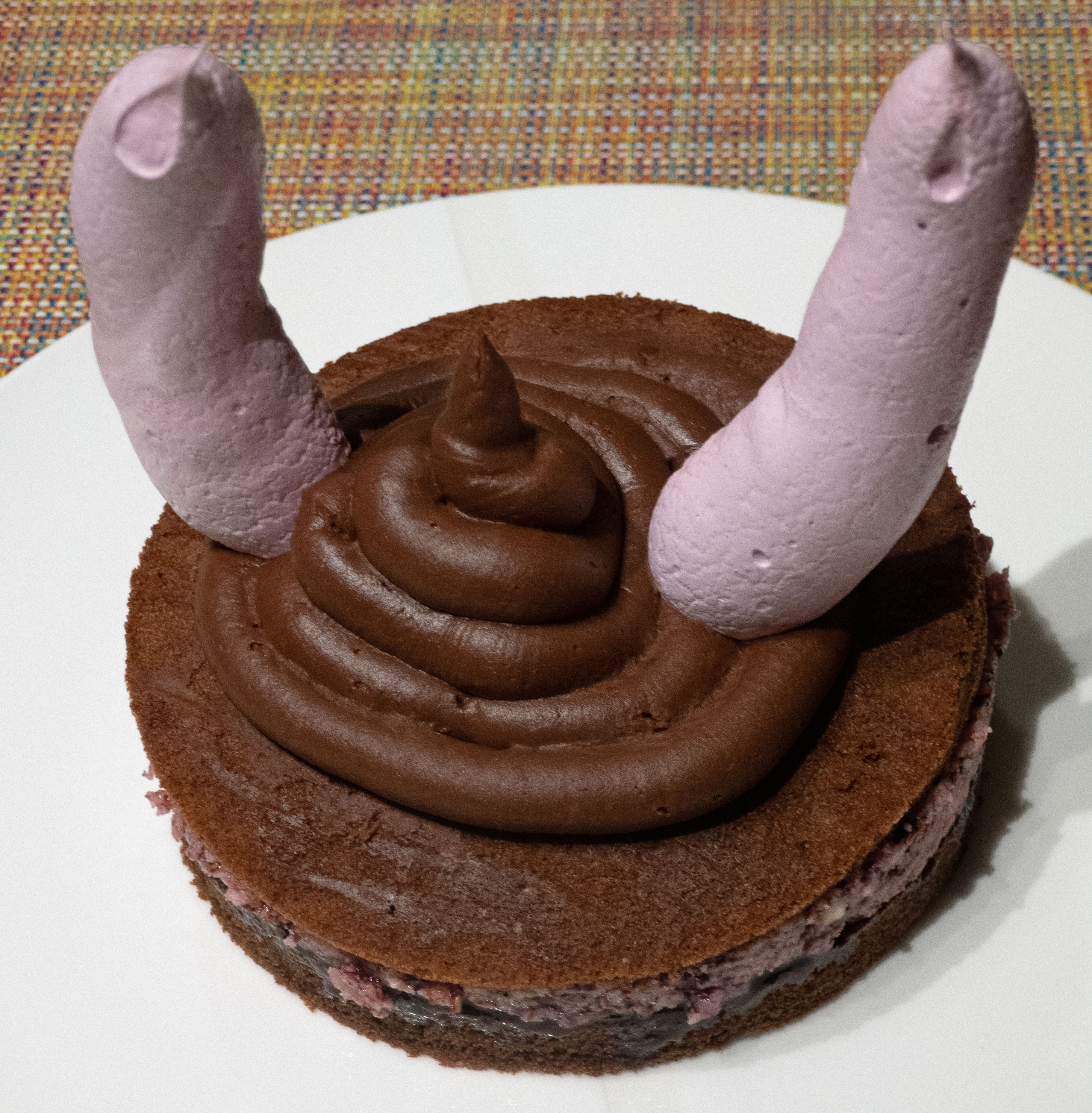 La recette du gâteau au chocolat vient de King Arthur Baking, le producteur de farine de la plus haute qualité aux États-Unis. La recette de la crème au beurre aux mûres vient du blog Dessert for Two. La crème au beurre au chocolat vient de Sally’s Baking Recipes. Les cornes meringuées viennent de la recette de meringues de Cook&Record. Les recettes du gâteau et des cornes sont coupées par deux ; la crème au beurre aux mûres est multipliée par deux. Je dois le blog Level 1 Chef pour l’idée de fabriquer les cornes de meringue au lieu de chocolat. (Sinon ma recette n’a rien à voir avec la sienne, mais ses idées sont intéressantes.)