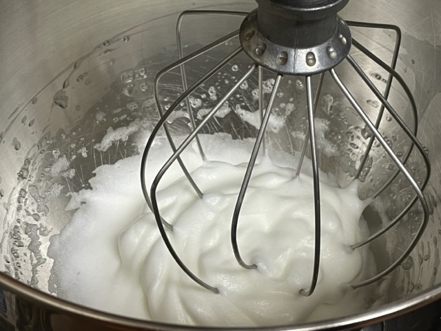 1. Dans le bol d’un robot, faire monter en neige les blancs d’œuf. À haute vitesse, pour être clair.