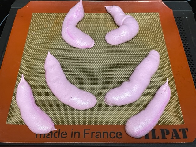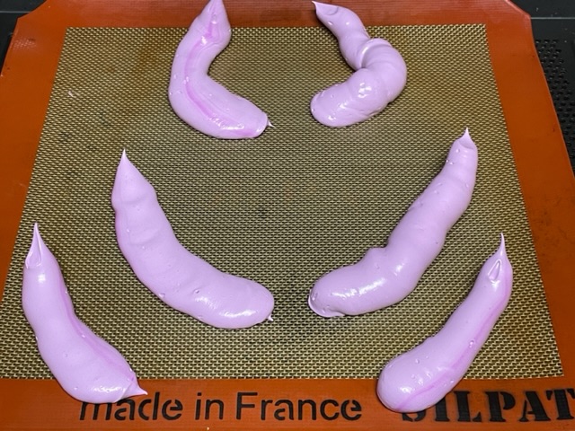 1. Mettre la meringue dans une poche à douille avec une douille plate assez grosse. Dessiner des cornes en meringue sur un tapis en silicone, de son tour sur une plaque de cuisson.