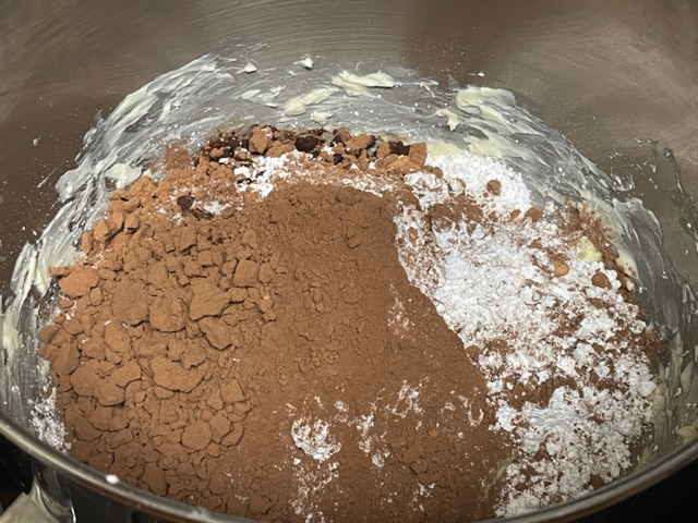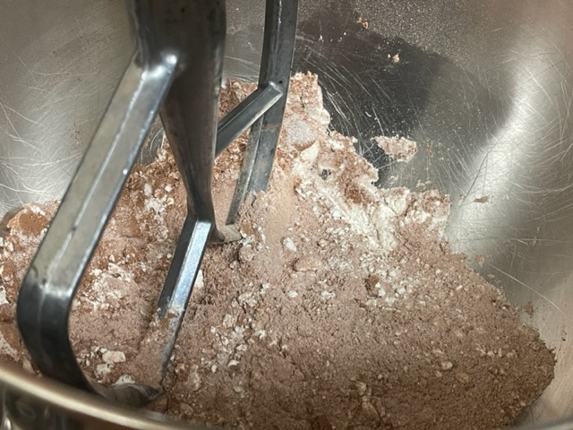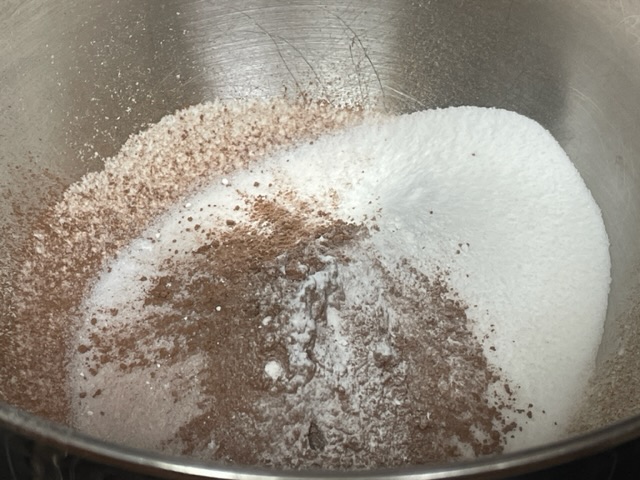 2. Dans le bol d’un robot équipé de la feuille, tamiser les ingrédients secs : le sucre, la farine, la poudre de cacao, le sel, le bicarbonate de soude et la lévure chimique. Mélanger bien.