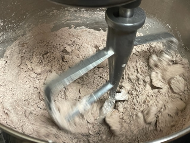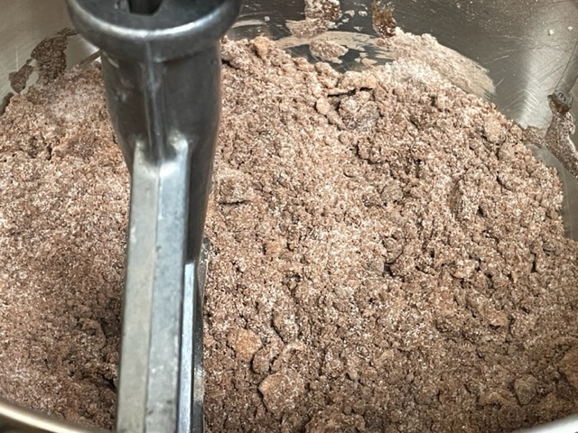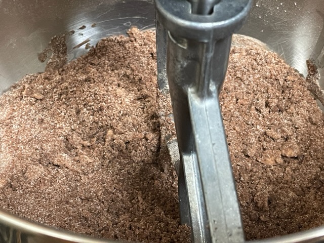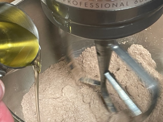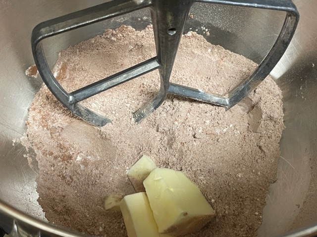 1. Ajouter le beurre et mélanger à petite vitesse pendant 1 minute. Ajouter l’huile et continuer de mélanger jusqu’à ce que la pâte devienne sablée. (Ça arrivera vite.)