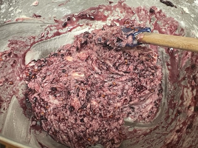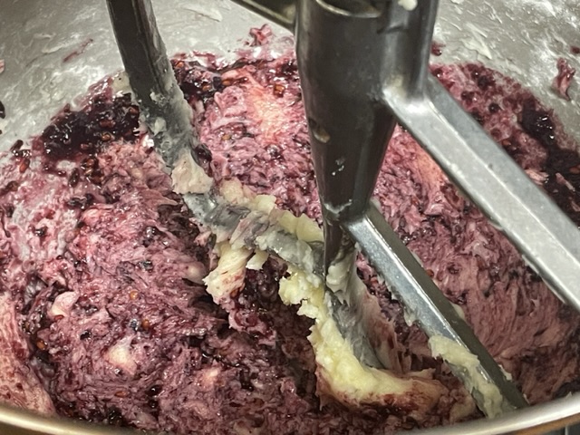 1. Laver et sécher les mûres. Les écraser avec un batteur plongeant. On peut tamiser la purée pour enlever les graines, mais il me semble que ça ne laisse pas assez de matériel. J’ai donc mis toute la purée dans le crème au beurre.