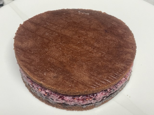 1. Déposer la deuxième couche en haut du crème au beurre. Mettre le gâteau au frigo.