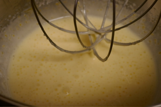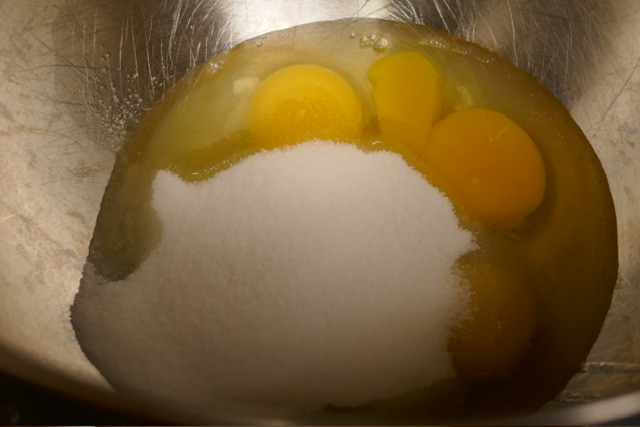 2. Dans le bol d’un robot équipé du fouet, fouetter les œufs et le sucre, jusqu’à ce que le volume triple.