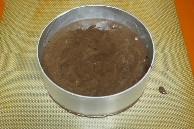 1. Verser la pâte dans le cercle. Égaliser avec la maryse si besoin, mais sachez qu’il faudra quand même couper le haut, alors ne vous inquiétez pas trop.