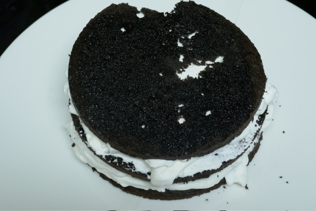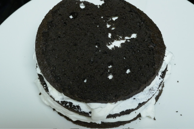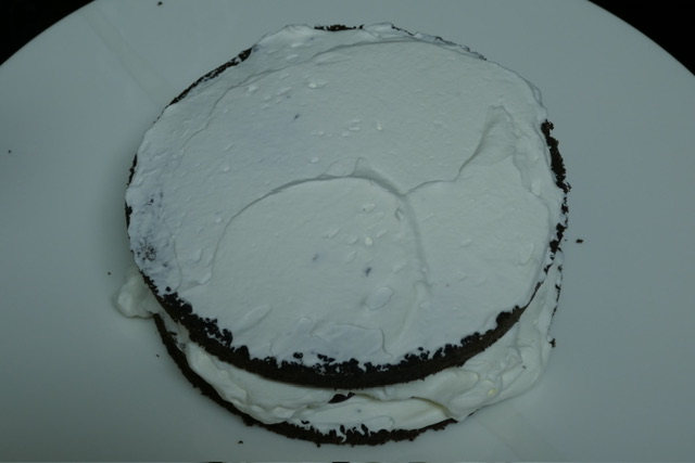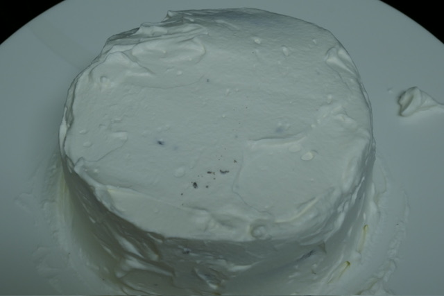 1. Mettre de la crème chantilly dans une poche à douille. C’est plus commun d’utiliser une douille étoilée ; j’ai utilisé une douille plat pour copier le gâteau de Portal, comme j’ai dit en haut. Dessiner des cercles de chantilly en haut.