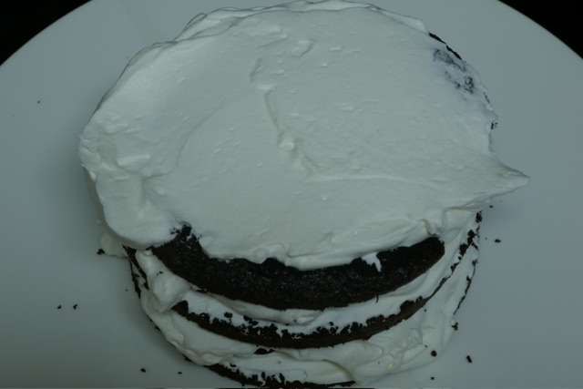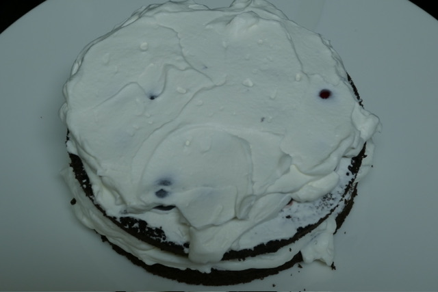1. Déposer la dernière couche au-dessus, badigeonner avec du sirop, et étaler plus de chantilly en haut. Mais cette fois, pas de cerises. Étaler plutôt de la chantilly autour des côtés du gâteau. Égaliser avec une spatule.