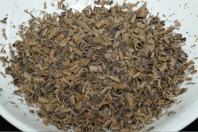 1. Laisser reposer au frigo jusqu’à ce que vous ayez rendu votre chocolat noir en copeaux. Ça va faire mal aux mains.