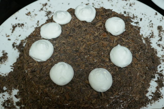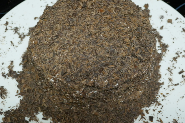 1. Avec les mains, décorer les côtés et le haut avec les copeaux de chocolat. Il y a un risque que vous allez devoir l’essayer plusieurs fois pour que assez de copeaux y collent.