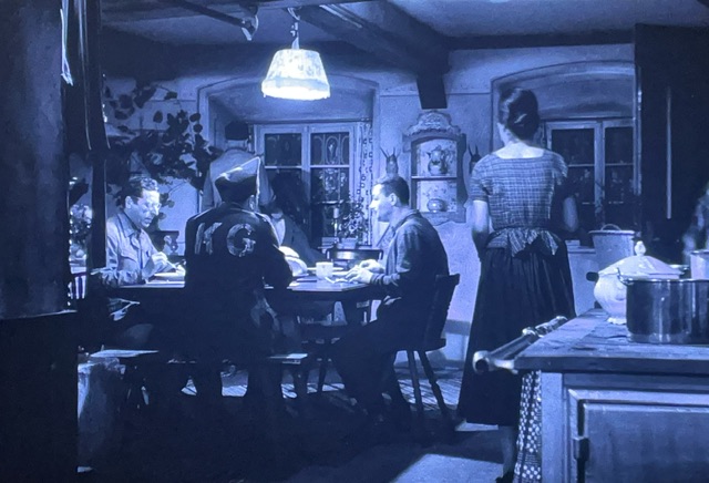 Le film commence dans une ferme quelque part dans le pays préféré du blog, l’Allemagne. Il faut que j’avoue que je n’ai pas bien compris la situation. Il y a quatre hommes qui vivent et travaillent dans la ferme avec une allemande. Ils sont prisonniers de guerre. Pourquoi est-ce qu’ils mangent assez bien et n’ont qu’une civile pour les surveiller ? De toute façon, ils mangent tous à la même table avec l’allemande. À la radio, de la propagande se joue en promettant que Churchill et de Gaulle seront écrasés par l’armée de la liberté.