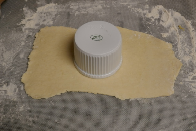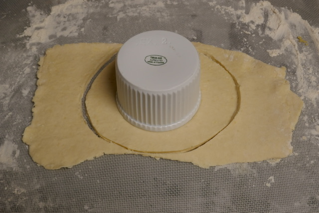 - Étaler la pâte feuilletée. Utiliser un ramequin en tant que guide pour couper un disque de pâte.