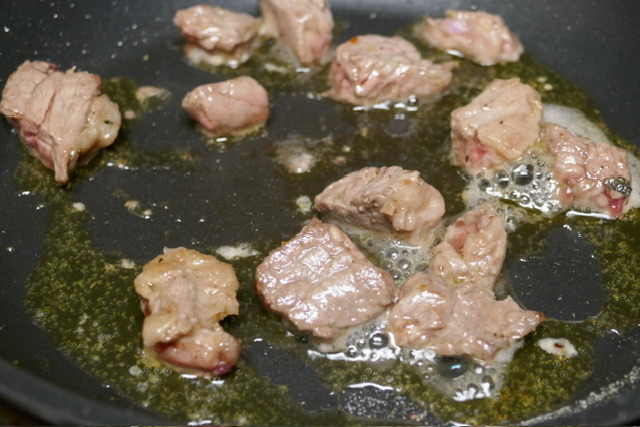 - Couper le paleron en dès et les faire revenir dans de l’huile d’olive. Saler et poivrer pendant que la bœuf cuite.
