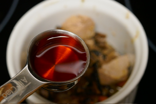 - Ajouter le vermouth, le jus de truffe (j’ai utilisé le liquide dans lequel mes truffes sont arrivées), et le consommé.