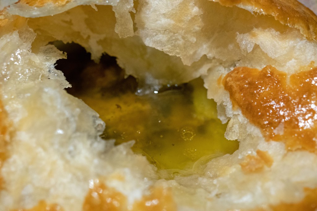 - Poser le disque de pâte feuilletée sur le ramequin et presser bien les bords afin qu’il concentre tous les parfums de la soupe à l’intérieur du ramequin. Badigeonnez avec le jaune d’œuf. Je recommande fortement que vous posez le ramequin sur une plaque de cuisson pour l’enfourner.