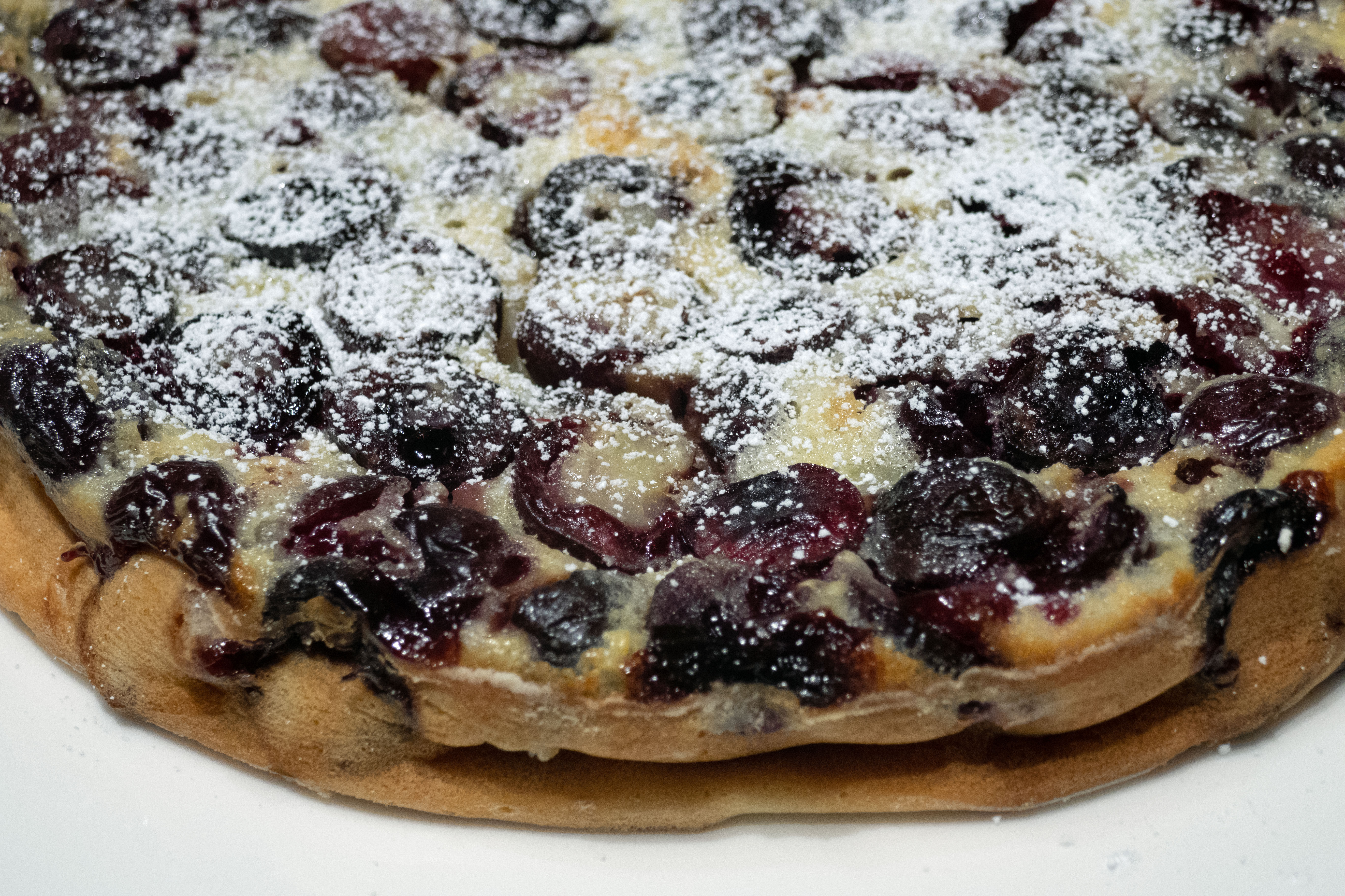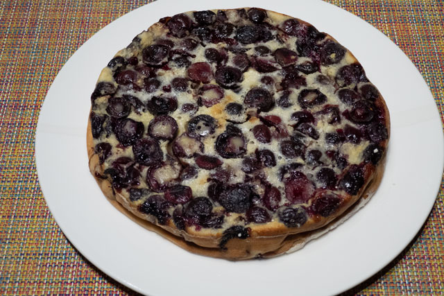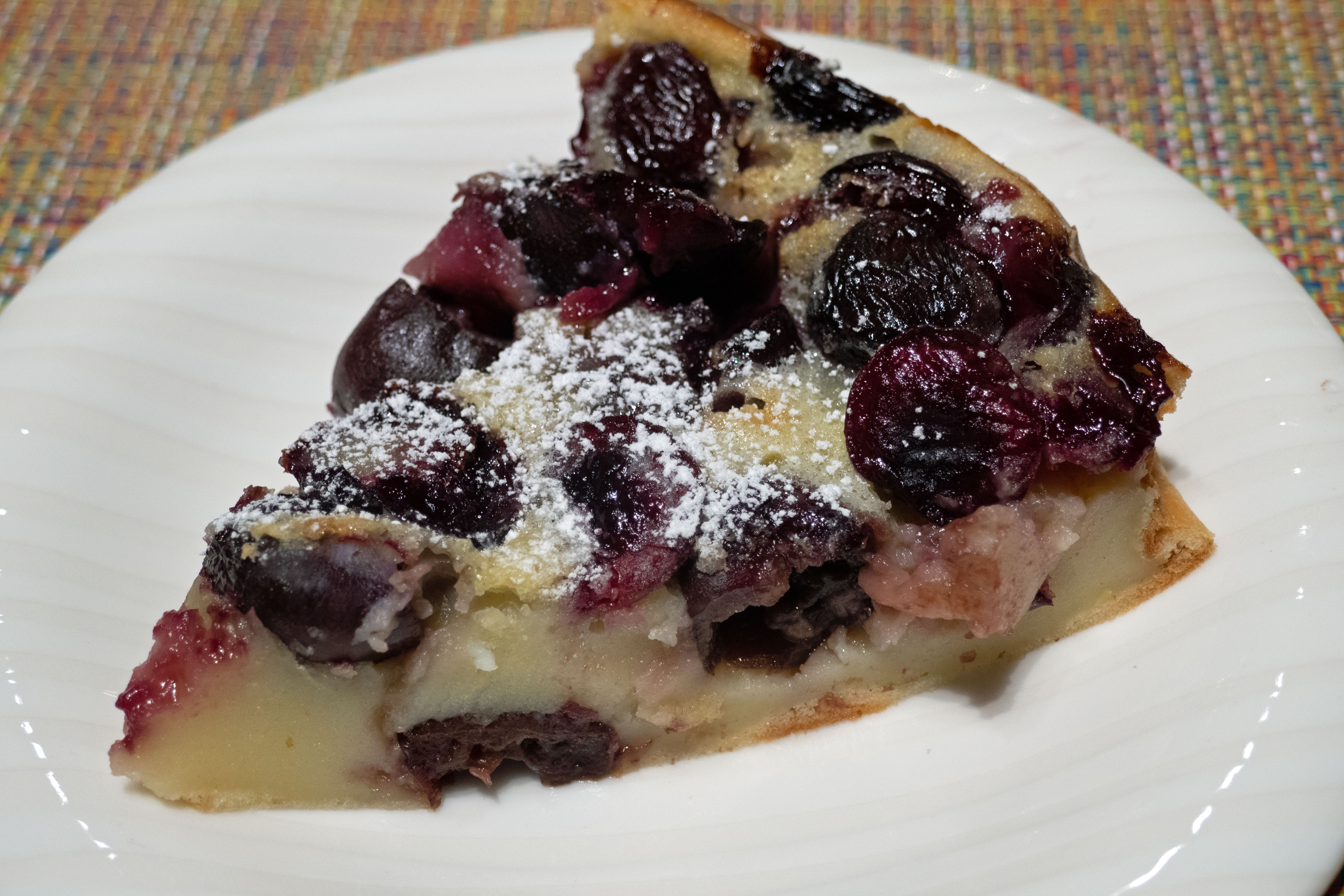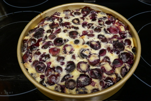 Mon dessert est le cacou, une spécialité locale très similaire au clafoutis, mais plus facile à démouler. Il y a exactement une différence entre ma recette et celle de la Confrérie des Francs-Cacous de Paray-le-Monial — je refuse absolument de mettre des cerises entières dans n’importe quel plat ou dessert. Il faut les dénoyauter tant que c’est moi qui paye le dentiste. La Fille a un appareil dentaire, et elle a partagé ce dessert. Je ne vais jamais lui donner des cerises entières. Les Francs-Cacous peuvent discuter avec sa mère s’ils ont envie de s’en plaindre. De toute façon, voici la version officielle — on trouvera exactement les mêmes ingrédients partout sur Internet. Mon moule fait 23 cm de largeur.