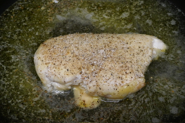 1. Faire dorer uniformément sur chaque face — 3 minutes le côté pour moi — puis verser le vin blanc, saler et poivrer et râper la noix de muscade au-dessus.