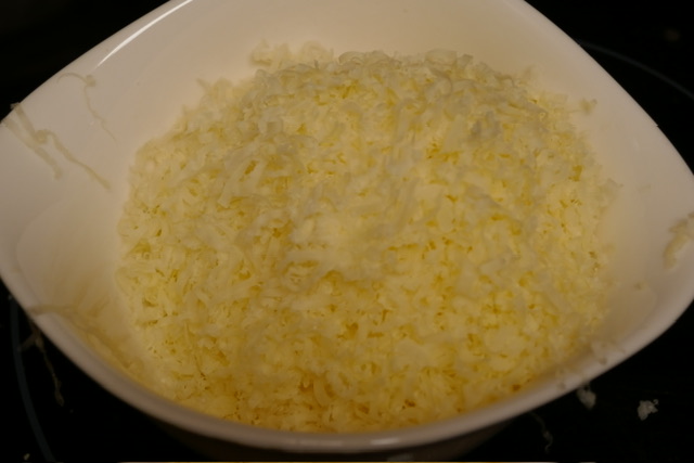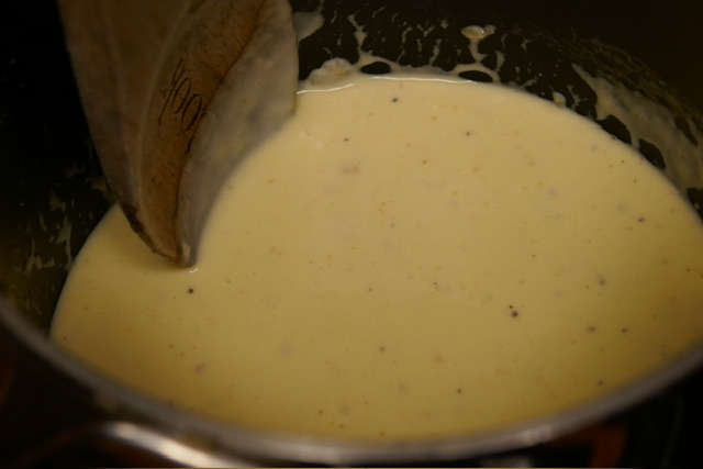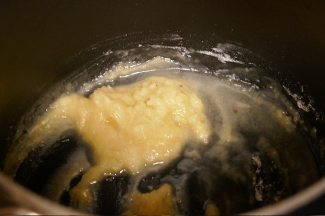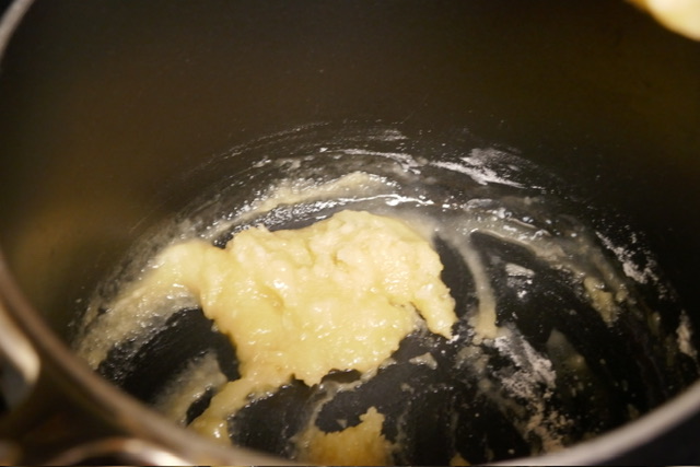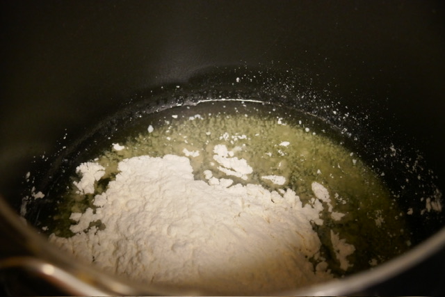 1. Pendant ce temps, râper le comté, puis préparez un roux blanc — faire fondre le beurre dans une casserole, ajouter le reste de la farine, mouiller avec un peu de jus de cuisson du poulet (j’ai utilisé 1 cuillère à soupe, tiré de la cocotte après 15 minutes de cuisson) et laisser mijoter 10 minutes à feu doux.