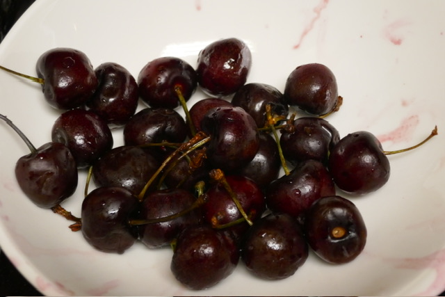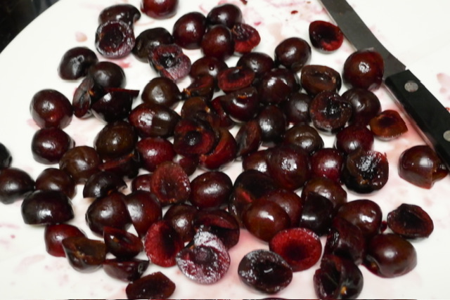 1. Dénoyauter les cerises à moins que vous soyez aventurier ou mannequin embauché par un dentiste. Je croyais 500 grammes un peu trop pour mon moule ; il s’est avéré que c’était faux, mais voici ce que j’ai coupé et ce qui me restait après.