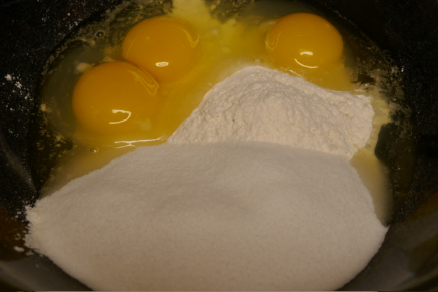 2. Dans un saladier, déposer la farine, le sucre, le sel puis les œufs. Mélanger avec une cuillère en bois.