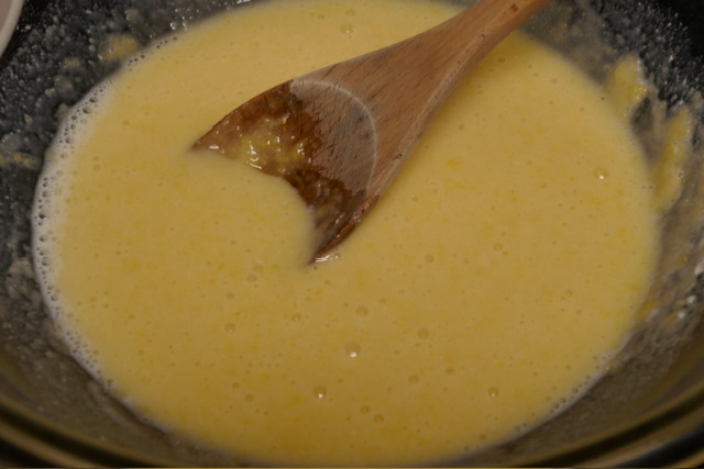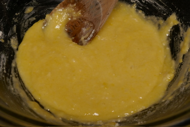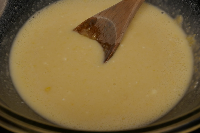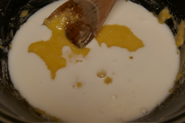 1. Ajouter ensuite le lait en deux fois et mélanger après chacune. Remuer bien pour une pâte homogène et sans grumeaux.