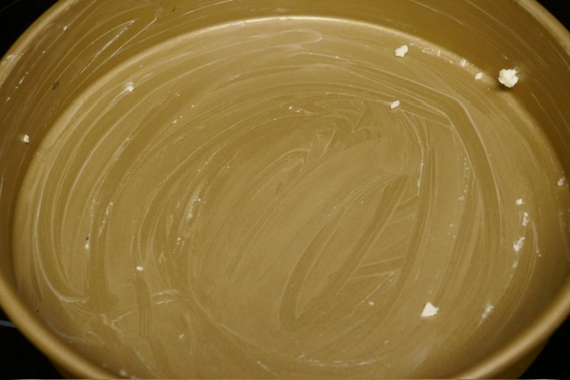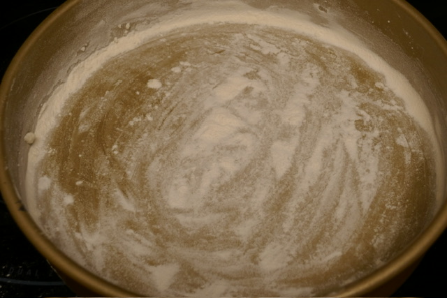 1. Bien beurrer et fariner le moule. Secouer pour enlever la farine qui ne colle pas. Déposer les cerises dans le moule. C’est ici où j’ai décidé d’ajouter toutes les cerises.