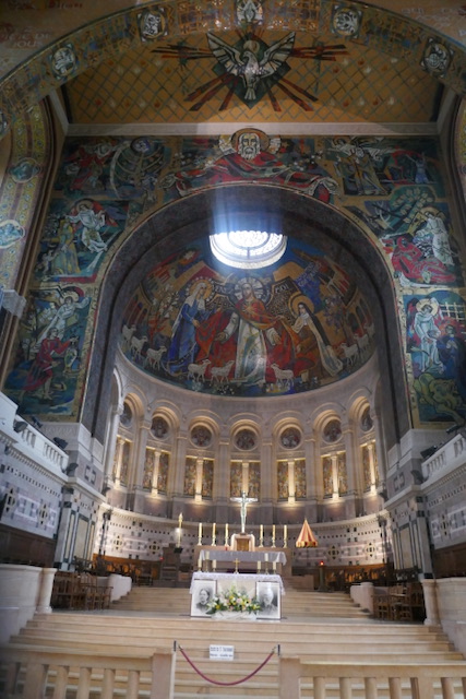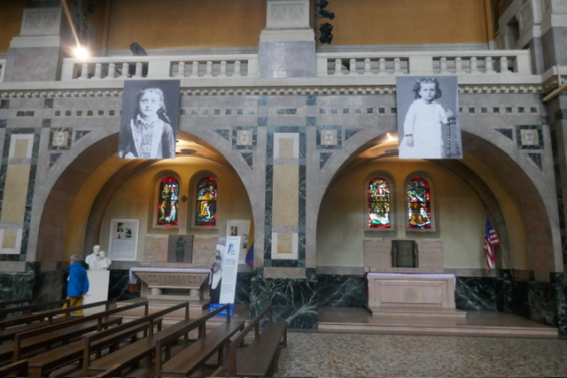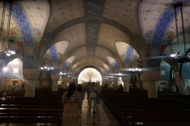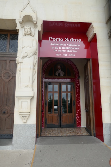 En haut, il y a la Basilique, avec des cadeaux de paroisses autour du monde, dont au Brésil et aux États-Unis. C’est un sanctuaire vraiment impressionnant. On entre par la Porte Sainte pendant cette année du centenaire de la béatification de Sainte-Thérèse :