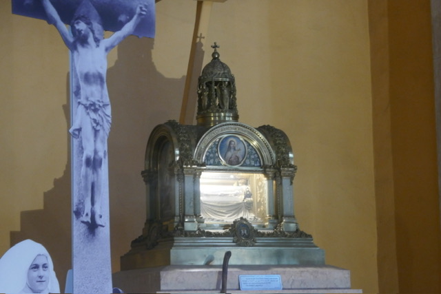 Dans la basilique, on trouve des reliques de Sainte-Thérèse elle-même. On ne peut pas s’approcher du reliquaire, mais on peut y offrir des bougies :