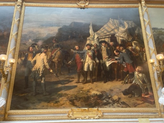 Je ne vais pas vous mentir, j’ai complètement raté ce tableau dans la Galerie des Batailles la dernière fois. C’est les généraux Rochambeau et Washington avant le siège de Yorck-town (on dit « Yorktown » en anglais) qui a mis fin à la Révolution américaine. Vous comprenez à quel point ça fait chaud au cœur :