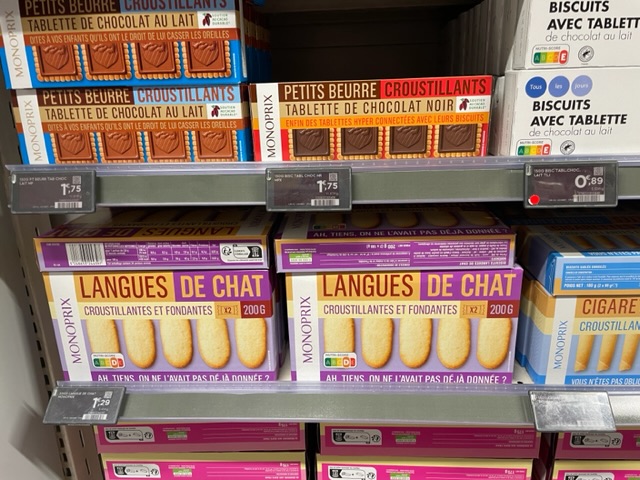 Les petits beurre croustillants, hyper-drôles aussi ! Au moins au chocolat noir — « enfin, des tablettes hyper connectées » ! Mais je dois avouer que je rate les deux autres. « Casser les oreilles » ? Le truc avec les langues de chat me rend complètement perplexe.