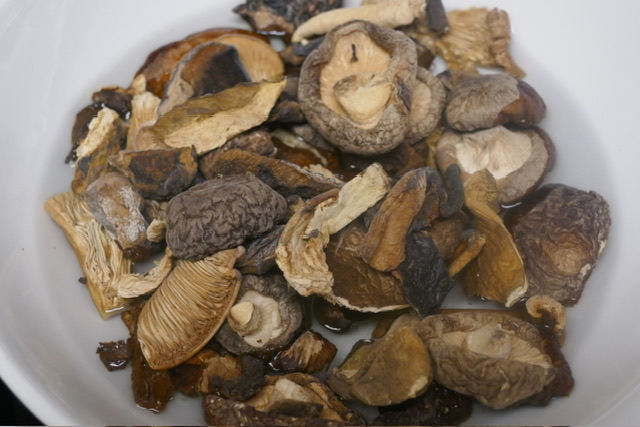 1. Tremper les champignons dans de l’eau froide, puis égoutter. Si vos champignons n’ont pas de queues, pas besoin d’une si grande quantité. 30 grammes de champignons secs suffisaient.