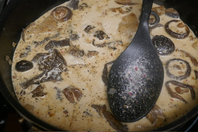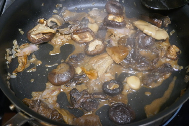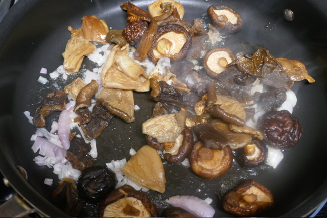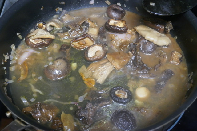 Ayant déjà des suprêmes de volaille à la maison, je n’ai pas acheté un poulet entier. Alors j’ai changé un peu la cuisson, mais les instructions sont plus ou moins les mêmes. La recette originale demande des morilles sèches ; voici mes champignons secs, un mélange qui servait le même but :