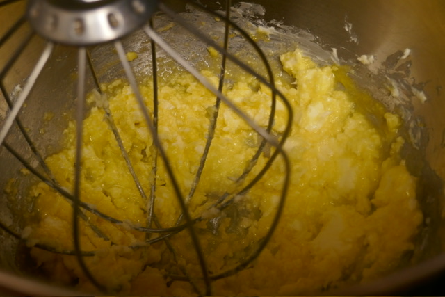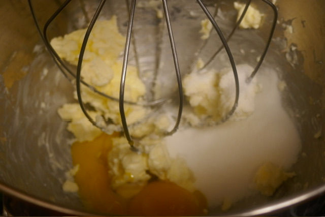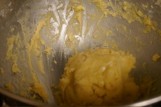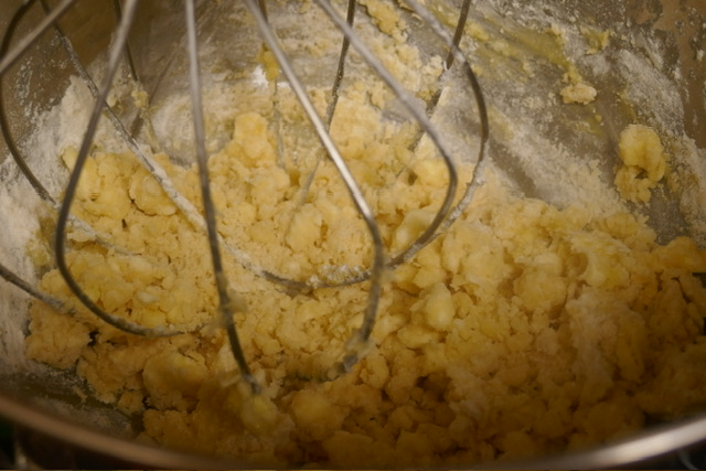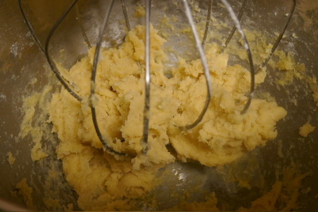 1. Ajouter la farine en plusieurs fois. Fouetter après chacune. La pâte devrait devenir sablée, puis homogène. Parfumer avec de la vanille liquide ou du zeste de citron si envie. Les miens sont natures. Si la pâte ne se rassemble pas, ajouter du lait. (Je n’en avais pas besoin.)